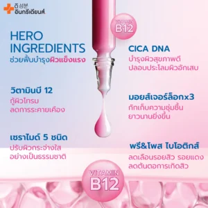 🌷✨ เซรั่ม B12 ฟื้นบำรุง Skin Barrier และสารสกัดอื่นๆอีก 12 ชนิด 🌷 🩵เซราไมด์ 5 ชนิด เสริมเกราะป้องกันผิวให้แข็งแรง 💚ซิก้า ดีเอ็นเอ ปลอบประโลมผิวอักเสบ ลดการระคายเคือง 💙มอยส์เจอร์ล็อก 3 ชนิด เติม&กักเก็บความชุ่มชื้นให้ผิวยาวนาน 💛วิตามิน B5 ฟื้นบำรุงผิวให้ความชุ่มชื้น 💜วิตามิน B3 ผิวกระจ่างใส ลดการระคายเคือง 🧡พรี & โพสไบโอติกส์ ปรับสมดุลผิว ช่วยให้ผิวกระจ่างใส 🚨 สีชมพูจากธรรมชาติของสารสกัด B12 ไม่ใส่สารแต่งสี 🫧 เนื้อบางเบา ซึมลงผิวไว ไม่เหนียวเหนอะหนะ